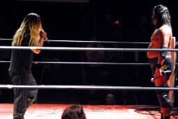 大鷲「本日は年末のお忙しい中こんなにたくさんお集まりいただきありがとうございました。あんだけ苦労したブードゥー・マーダーズ、シュウとケイと組んで倒しました。何年も敵対してきましたけど、アイツらは俺の後輩です。それはS.O.S.も一緒。ここに上がってる皆は仲間です。そんな仲間たちとこの2年間、紅白プロレスというリングで、皆さんには申し訳ない言い方ですが、いい思い出ができました。12月26日をもって無期限休業に入りますが、いつ復帰するとか約束できない。そんなあやふやな状態で俺の大切な家をほったらかすわけにはいかないから、紅白プロレスは今日を持って終了とさせていただきます。」(左写真)