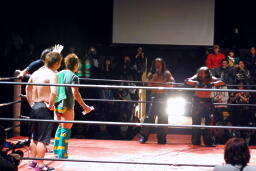 TARUが観客を挑発(右写真)。シュウが「お前らには借りがあるんだ。大鷲と俺ら2人でお前ら3人とやってやる!」急遽大鷲とバラモン兄弟が結託、VMに立ち向かうことに。