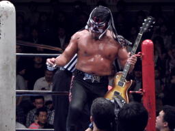 そして今日からANVILバージョンになったサスケがギター片手に入場(右写真)。
