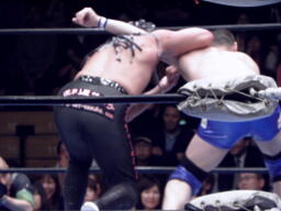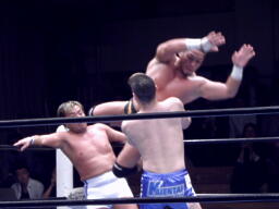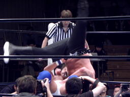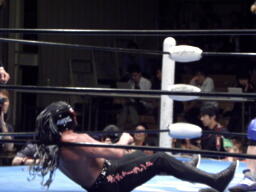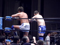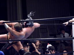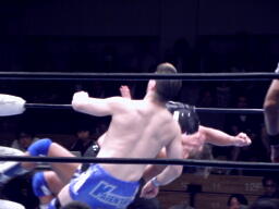 東郷はFUNAKIをコーナーに詰めてパンチ連打、背後からTAKAが近づくと反転クロスボディ(右写真)。TAKA場外転落。