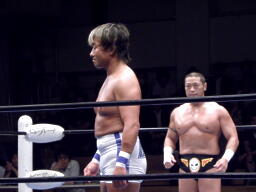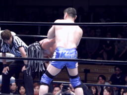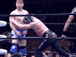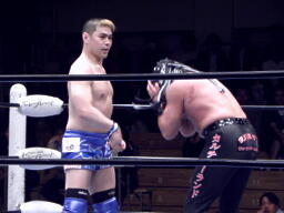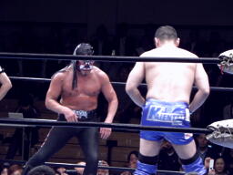 東郷スリーパー(右写真)、TAKAブレークしてロープに飛ぶ、東郷バックエルボー、腕を取ってサスケにタッチ。