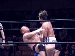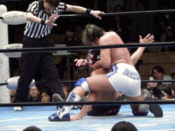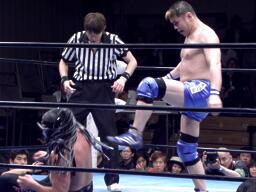 アキレス腱固め掛け合った状態で張り手の打ち合い(右写真)、結局TAKAがロープ。TAKAキック、サスケダウン。TAKAはFUNAKIにタッチ。