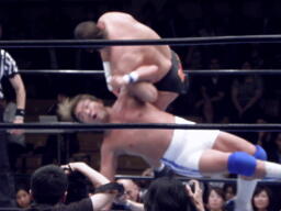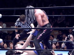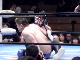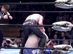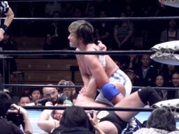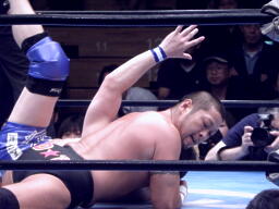 FUNAKIスナップスープレックス(左写真)、カウント2。もう一度カバー、カウント2。