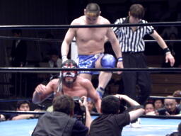 サスケTAKAにフェースロック。タイツの尻には「便利屋サスケ」の文字(左写真)。リリースしてボディスラム、東郷にタッチ。5分経過。