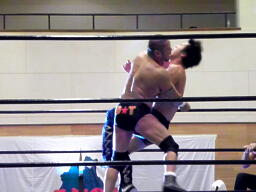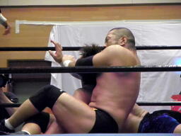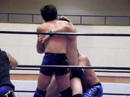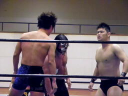 つかみ合っての殴り合い(左写真)、野橋が引き剥がして投げっ放しジャーマン。日向寺は東郷にタッチ。ハヤトも野橋にタッチ。