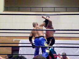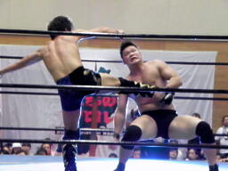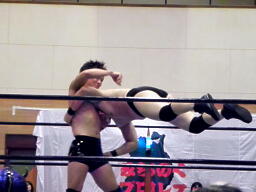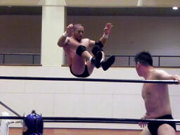 野橋ブレーンバスター、日向寺ブロック。野橋張り手、ロープに飛ぶ、日向寺カウンターのドロップキック(右写真)、東郷にタッチ。