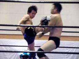 日向寺とハヤトがリングイン。ロックアップ、日向寺ロープに押し込む、張り手。ハヤトエルボー、ミドルキック(左写真)。日向寺ヘッドロック、ハヤトロープに振る、日向寺ショルダーブロック。日向寺ハヤトを場外に。