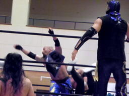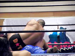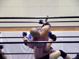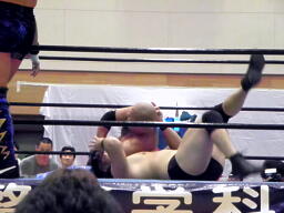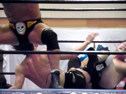 日向寺ハヤトにエルボー(左写真)、ハヤトはキック。ハヤトキャメルクラッチ、日向寺腕に噛みついて脱出。ハヤトは野橋にタッチ。