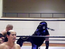 ハヤトも今日が復帰戦(右写真)。しかしエプロンに上がる仕草を見る限りヒザは力が入らない様子。