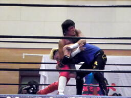 拳王ドラゴンスープレックス狙う、南野ブロック(左写真)。
