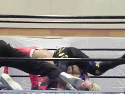 そのスキにまぐ狼がイス攻撃、南野カバー(左写真)、レフェリーカウント取るが2。