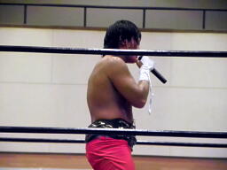 拳王「おいタケシ、やる前、ゴチャゴチャ言ってたけど、これで俺の、本当の強さ、わかっただろ。おい、俺はな、お前らと違ってメチャメチャな気持ちで、このリングに上がってるわけじゃないんだよ。高い志を持って、このリングに上がってる。だから、俺がずっと、このリングの、チャンピオンだ。ここにいるみんな、俺のことが怖くなかったら誰でも挑戦、受けてやるよ。」(左写真)