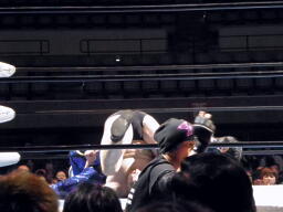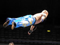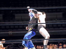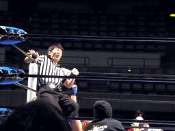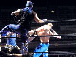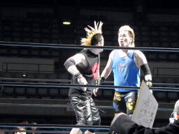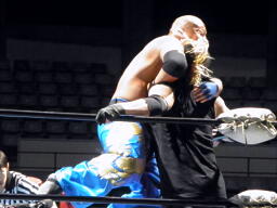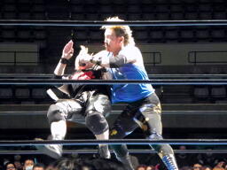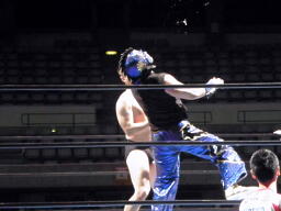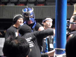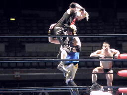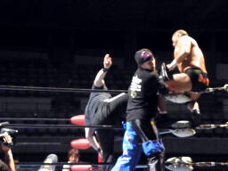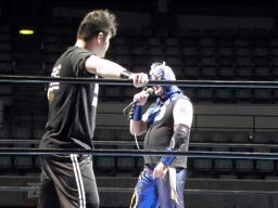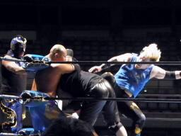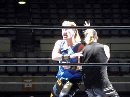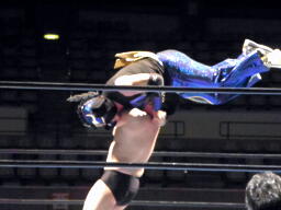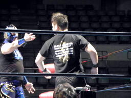 ウルティモがラ・マヒストラル(右写真)、大柳3で返す。しかしパンチ田原が間違ってゴング鳴らしたため一瞬会場が「?」なムードに。パンチ「試合は続行されます。」大柳スクールボーイ、カウント3。