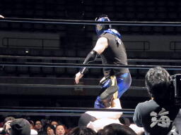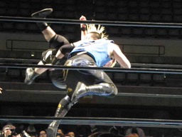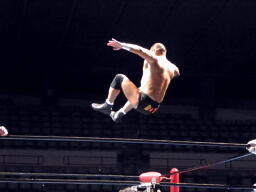 コーナーに上ってミサイルキック(右写真)、カウント3。