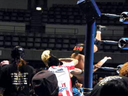 ウルティモが裏切り者Kenの制裁に向かう(右写真)。セコンドも加わり集中攻撃。