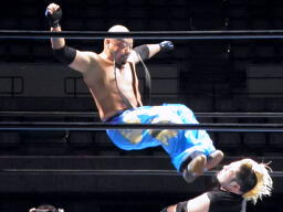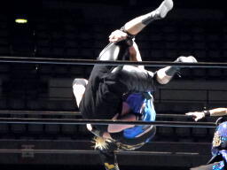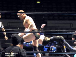 野橋ロープに振ってバックエルボー(右写真)、ストンピング。ウルティモが入る。ダブルの股裂きから野橋がコーナーに振ってウルティモがビッグブーツ。野橋カバー、カウント2。南野入ってロープに振ってエルボー、カウント2。パイルドライバー狙う、Kenブロック。南野はウルティモにタッチ。