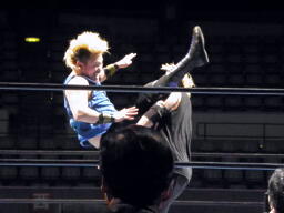 南野が入ると逆水平の打ち合い(右写真)、Kenエルボー、南野ヘッドバット、コーナーに振って串刺しラリアット、カウント2。