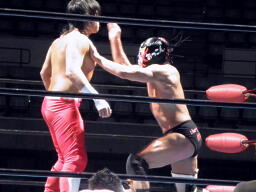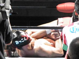 サスケは拳王をコーナーに詰めてボディへのパンチを連打(左写真)。