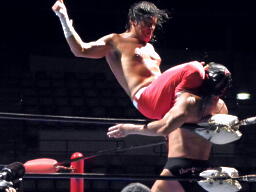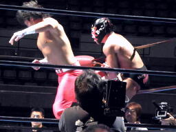 サスケは拳王をエプロンに出してフェースバスター(右写真)。さらに肩を強打させられた拳王は場外に転落。