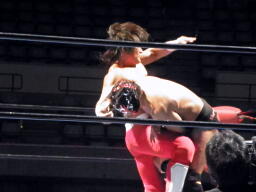 サスケ再度コーナーに上ってセントーン・アトミコ(左写真)。この技はやっぱりかわされる。