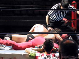 拳王は自分の肩を気にしながらミドルキック3連打(右写真)、サスケダウン。拳王カバー、カウント2。
