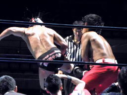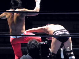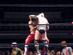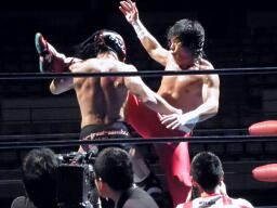 拳王がネックロックに切り返すがサスケはさらに切り返してワキ固め(右写真)、拳王ロープ。