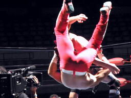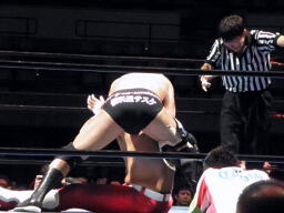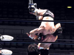 サスケは拳王を持ち上げるとロープに引っ掛けてイーヴンフローDDTに(右写真)、カウント2。