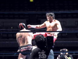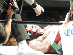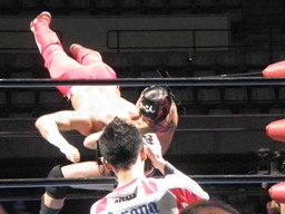 キャプチュードでトップロープ越しに場外に投げる(右写真)。拳王くるっと回ってエプロンで腰を強打。