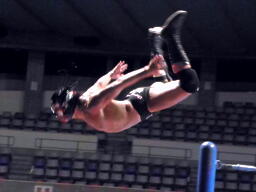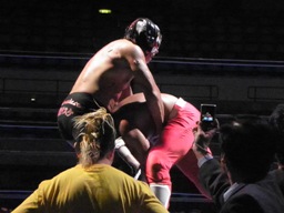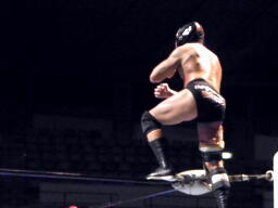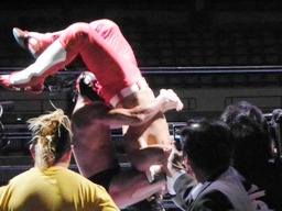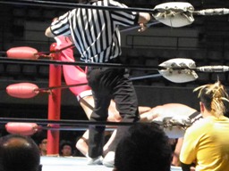 サスケボディスラム、コーナーに上ってXPW(左写真)、スッポ抜けたもののカバー、カウントは2。