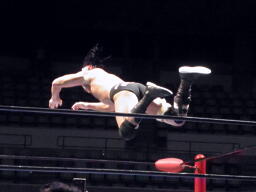 サスケは一旦リングに戻ると拳王目掛けて鉄柱越えトペ・コン・ヒーロ(右写真)。サスケリングに戻る。拳王はこの時肩を痛めた様子。