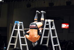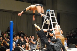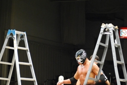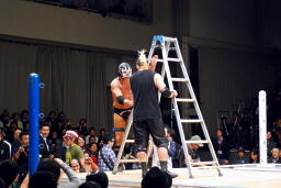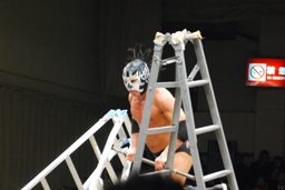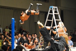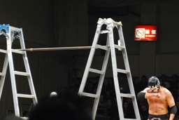 サスケは佐藤兄弟を和桶にぶつけるとリングにラダー立てる(左写真)。