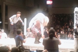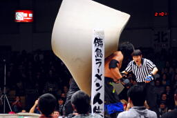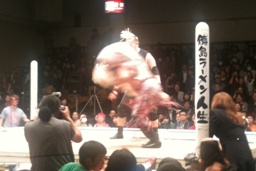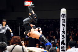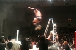 サンマをリングの板の上にぶちまけると恵が「魚の上にフィッシャーマン!」と叫んでサスケをフィッシャーマンズスープレックス(右写真)、カウント2。ここでカメラが電池切れ。恵は板が外されてむき出しになった鉄骨にサスケをパワーボム、カウント2。25分経過。