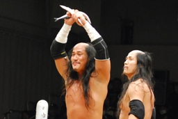佐藤兄弟はダブルのブレーンバスター(右写真)、Kenすぐに立ち上がる。