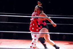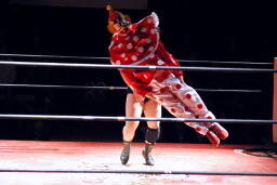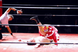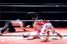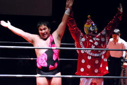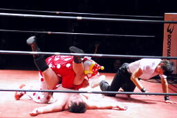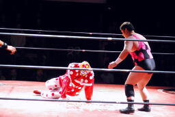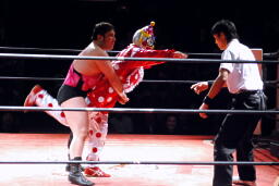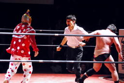 佐渡レフェリーのラリアットがくいしんぼうに決まる(右写真)。