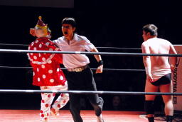 アントン一旦場外で息を整える。戻ろうとするとくいしんぼうがロープを蹴って急所攻撃(左写真)。