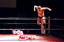 アントンコーナーに上ってダイビングフィストドロップ(左写真)、カウント3。