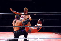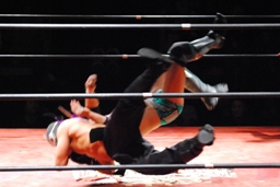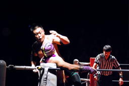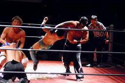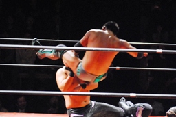 政宗ロープに飛ぶ、澤ジャンピングハイキック(右写真)、カウント2。