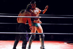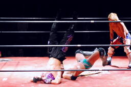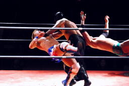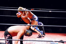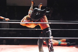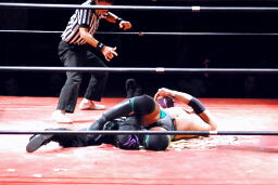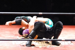 澤お卍固め、政宗はこれをブレークすると澤の首を取って希首座(左写真)、カウント2。
