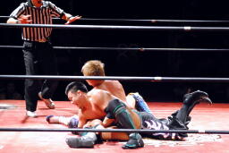 政宗は伊良部パンチをブロックして変形のバックドロップホールド(左写真)、カウント2。
