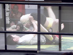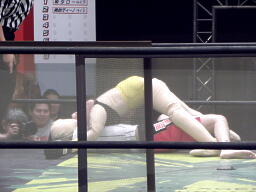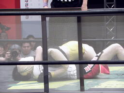藤岡は弓矢固めっぽい体勢になるが(右写真)ヨシヒコ常人では不可能な体の柔らかさで脱出。