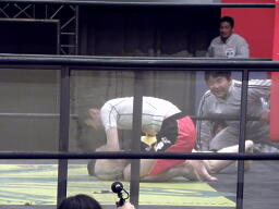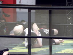 ヨシヒコ前転して脱出、腕をキャッチしてワキ固めに(左写真)。