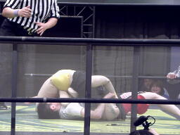 ヨシヒコひっくり返してケサ固め(左写真)。2分経過。