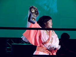 前日のアイスリボン後楽園大会でICE×60新王者となったさくらえみがベルトを掲げて入場(左写真)