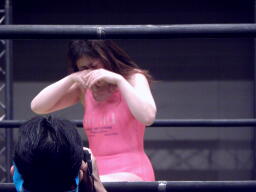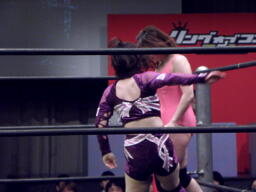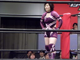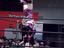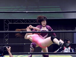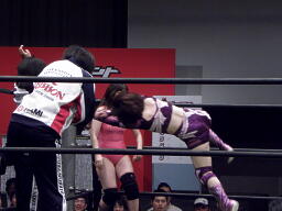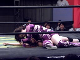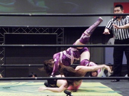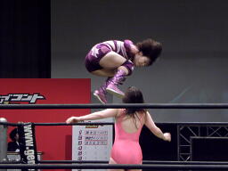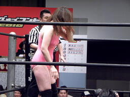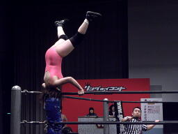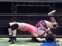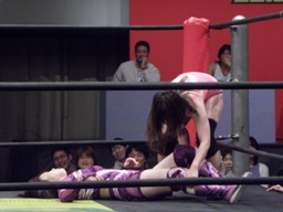 コーナーに振って真琴とりほが串刺し攻撃、そしてさくら58kg(右写真)。はいはい試合には関係ない後輩が先輩の引退試合に乱入ね、あるある。