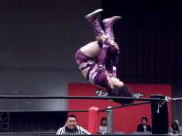 ムーンサルトプレス(右写真)、しかしさくらかわす。