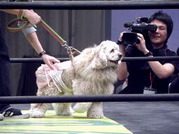 引き続き引退セレモニー。GAEA JAPANの師匠である長与千種さん・・・のパートナーのライオネス飛鳥さん・・・の飼っているのと同じ犬種のアメリカンコッカー・スパニエルから花束贈呈(右写真)。犬がリングに上がるのは以前のマッスルでもあったが、犬が花束贈呈というのは初めてだなあ。