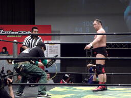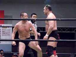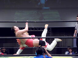 ヒカルリリースしてバック取る、大谷切り返して投げっ放しのドラゴンスープレックス(右写真)、カウント3。