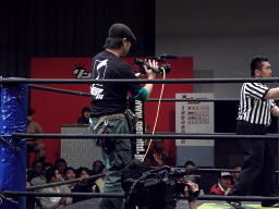 大谷カメラごとの顔面ウォッシュを狙うが実況の「そのカメラは37万円です。」の言葉と松井レフェリーのの制止で思い止まる(右写真)。
