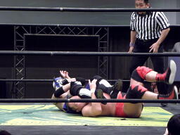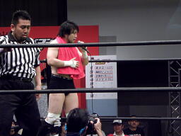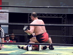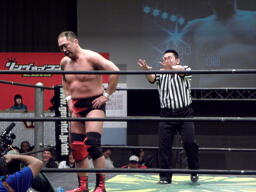 大谷はこれを持ち上げるとマットに叩きつけてそのまま片エビ固め(右写真)、カウント3。