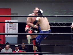 大谷が助走をつけてラリアット狙う、獣神サンダー大家はかわしてスピアー(右写真)。